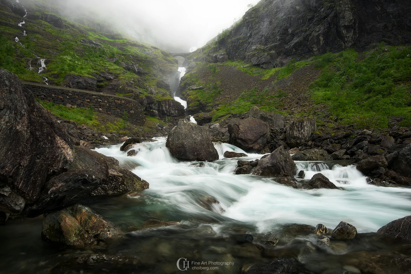 Down from the mountains we parked the car next to the road and I started hiking up the crystal blue river. After scrambling over some slippery rocks I found a composition that showed Trollstigen from a completely new perspective.